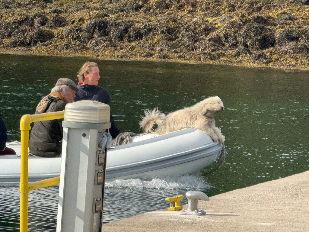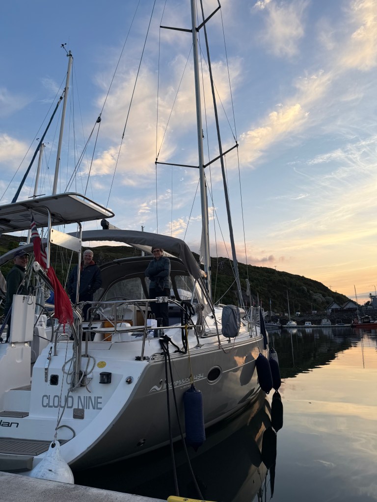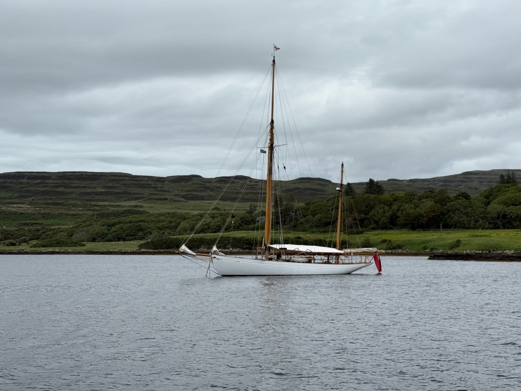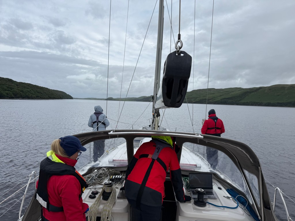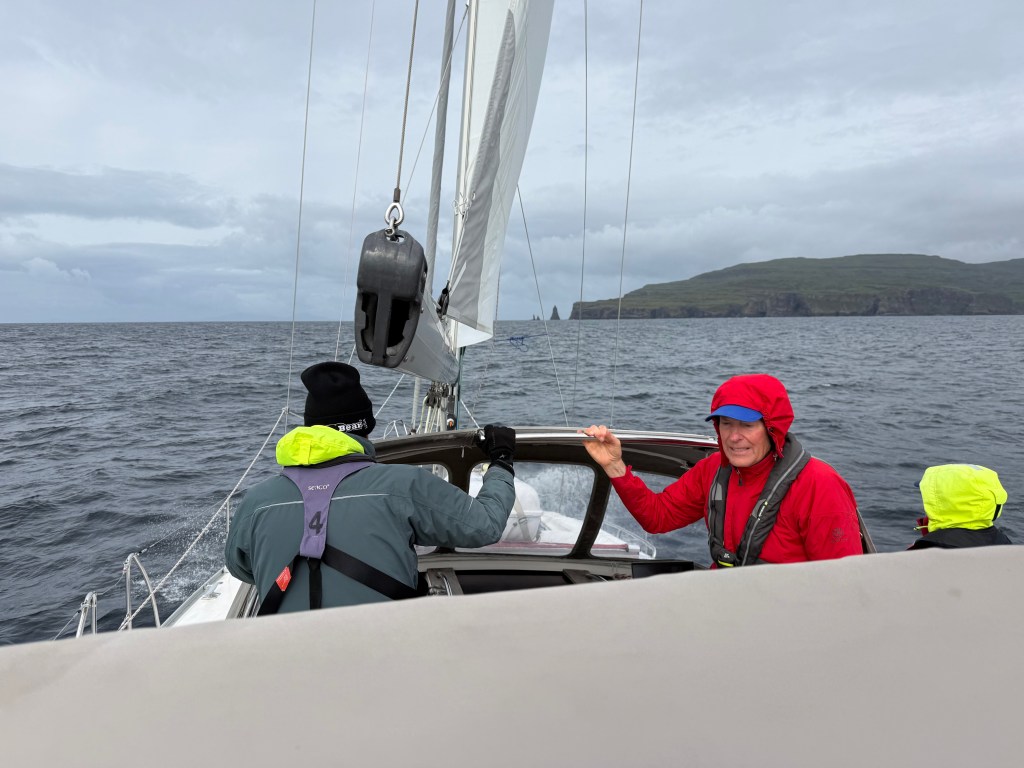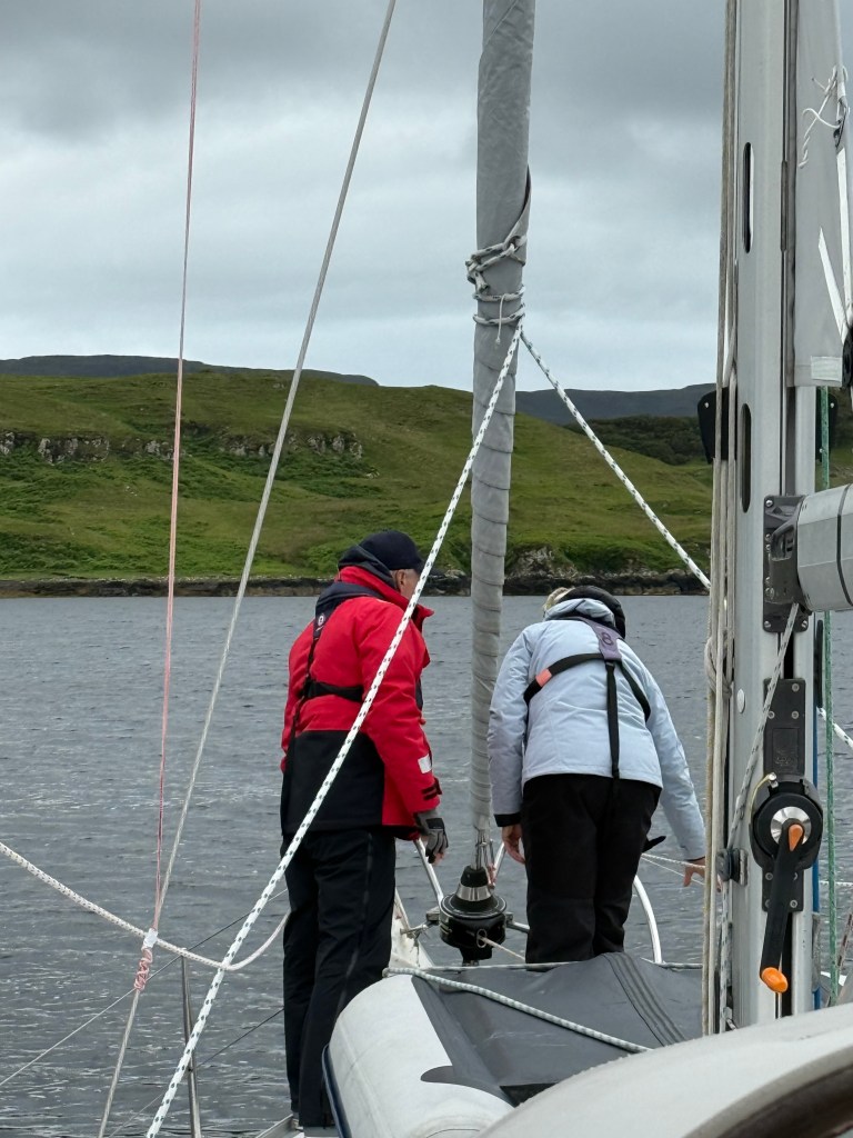 Once around the peninsula that formed the western shore of the approach to Dunvegan and its noteworthy castle, all six of us students executed successful upwind man overboard maneuvers using a technique John had developed and perfected over many years. John’s wife Paivi (“pi vee”) took pleasure tossing balled up sheets of newspaper the size of a person’s head into the sea for each one. In turn, each of us executed a simple five step maneuver to affect recovery: 1) one-half turn of the helm away from the wind to heave-to and slow the boat, 2) race to and deploy the Life Sling, 3) turn more in the same direction back toward the person in the water with the aim of passing them within 2 meters and instructing them on donning the life sling, 4) upon reaching them a second time, turn away again into the heaved-to orientation, and 5) drawing them to the boat with the Life Sling. The methodical steps with which one learns to parallel park blind-folded come to mind. All six drills went like clockwork.