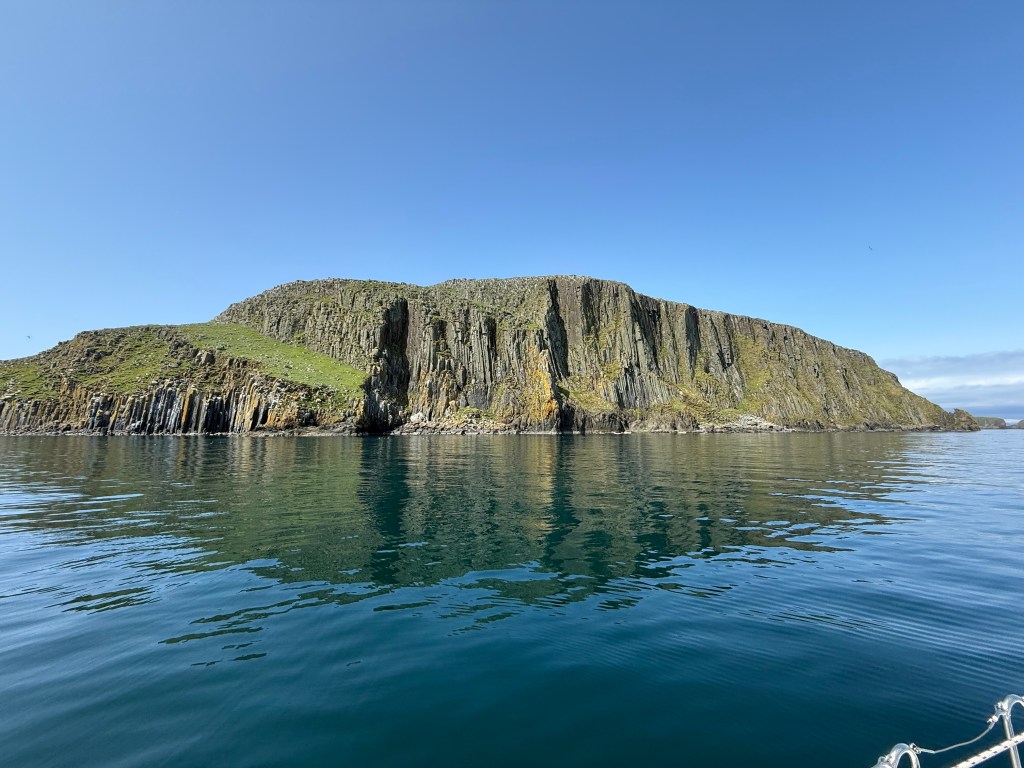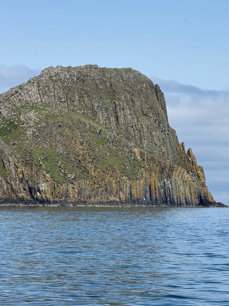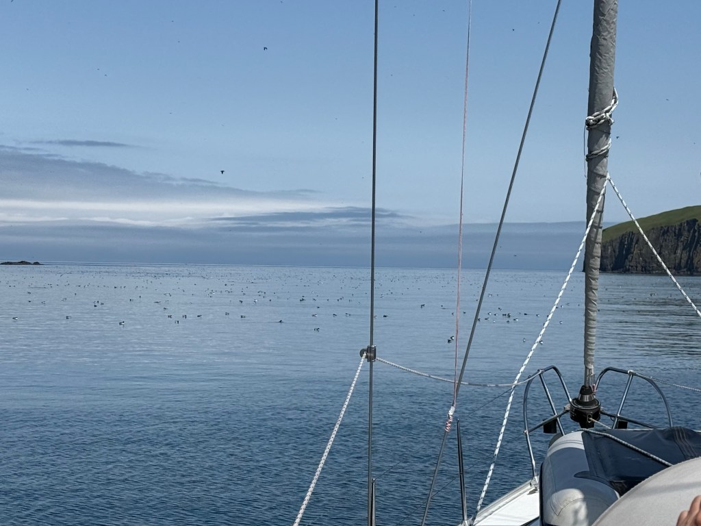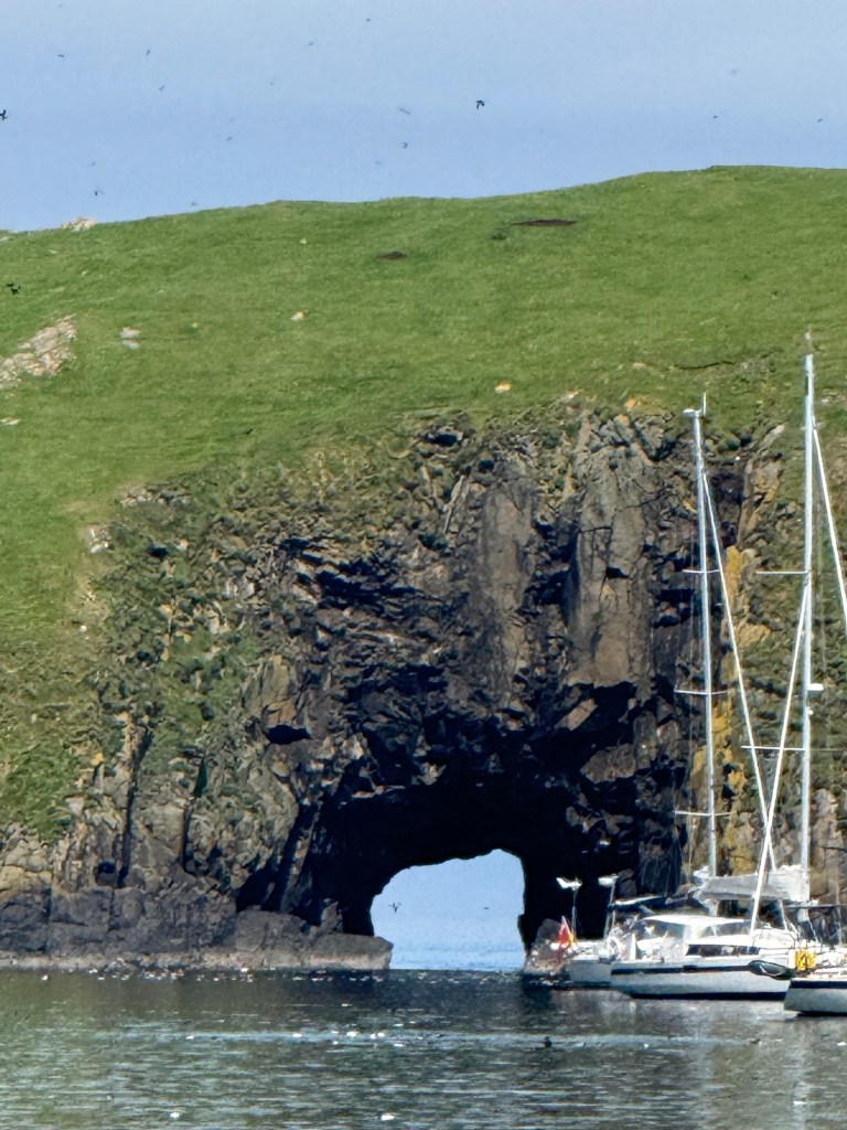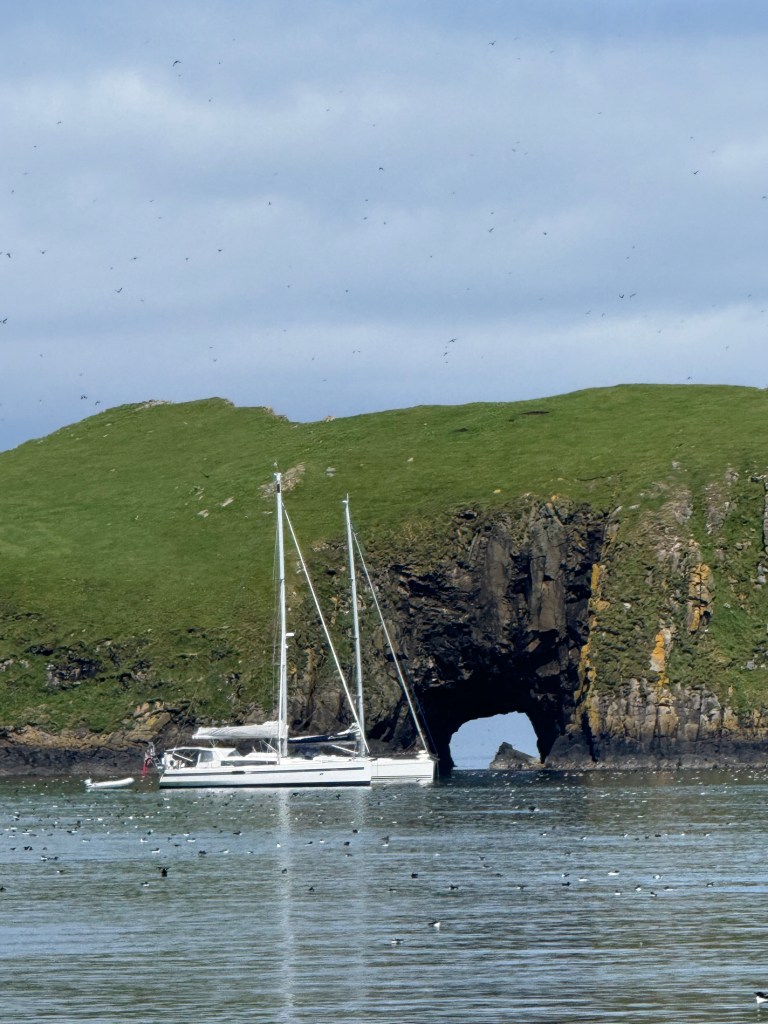 While we did not even make an attempt to sail out to St. Kilda Island, we did find magic in the Shiants. A two-hour motor sail northeast of Tarbert brought Cloud Nine to this most incredible marine bird sanctuary. at which we dropped anchor for lunch and admired the continuing spectacle of huge numbers of Gannets, Puffins, Guillemots, Razorbills, Cormorants, and – closer to the islands – Fulmars.