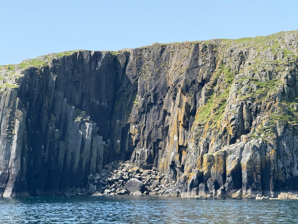 Though very hard to see (look for tiny white specs especially in the shadows), there are swarms of Puffins both flying over the north Shiant Island and all over the hillside.