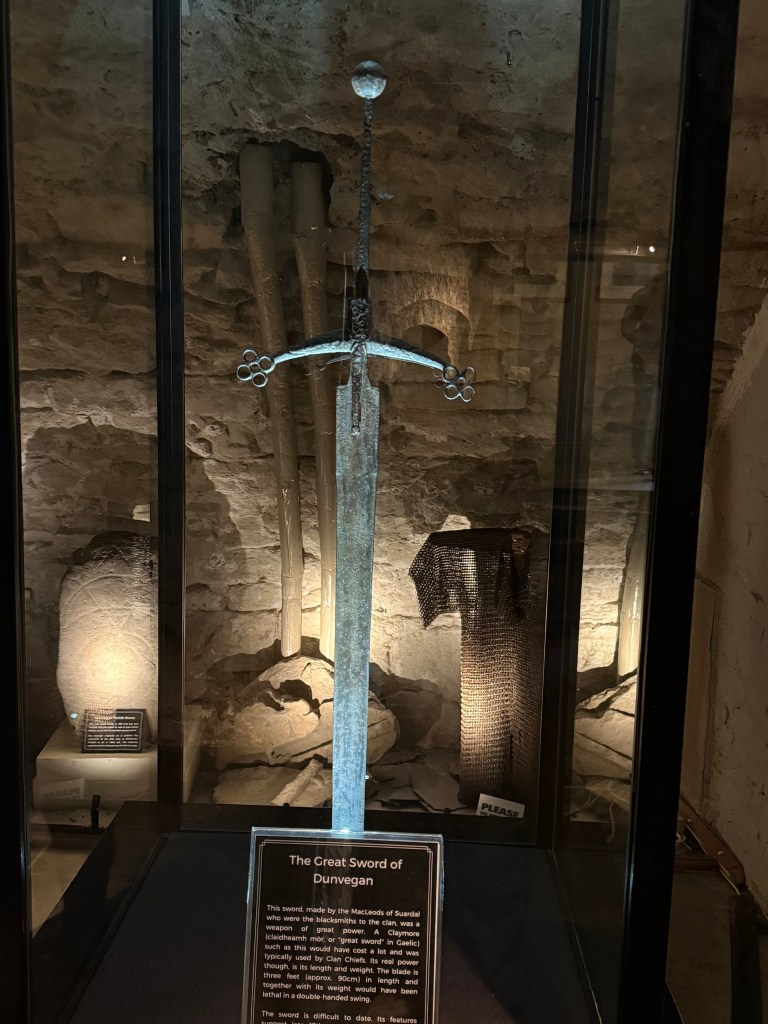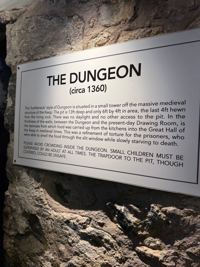 The Great Sword above is made of Scottish, not German, steel. While not dated, it would have been used by early MacLeod clan chiefs. The punch line of the Dungeon plaque reads “In the thickness of the walls, between the Dungeon and the present-day Drawing Room is the staircase from which food was carried up from the kitchens into the Great Hall of the Keep in medieval times. This was a refinement of torture for the prisoners, who were able to smell the food through the slit window while slowly starving to death.” Pays to not screw up badly.