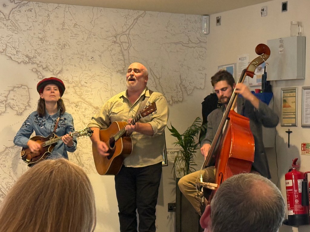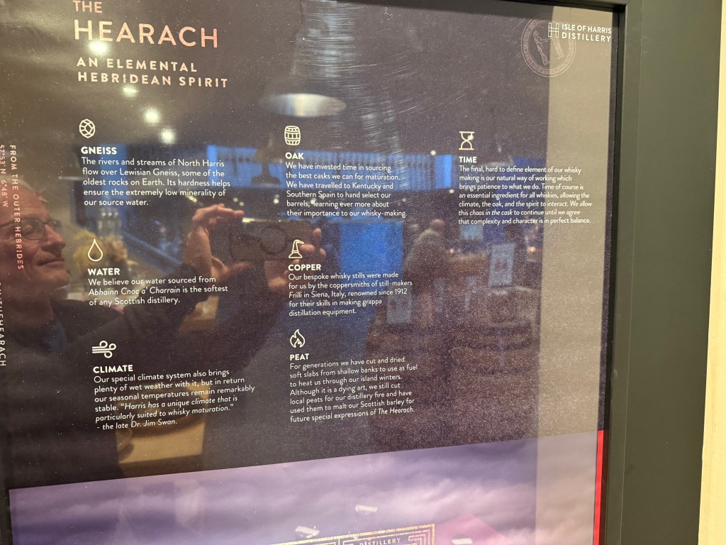 Tarbert has its very own distillery and right at the head of the bay near downtown! Drawn to The Harris Distillery by advertisement that a traveling trio, the “Hank Band”, would be playing this evening, we returned after dinner. I sampled their two whisky varieties, one aged in bourbon casks, the other, in Oroloso sherry casks, and found first very much to my liking. The distillery also produces gin.