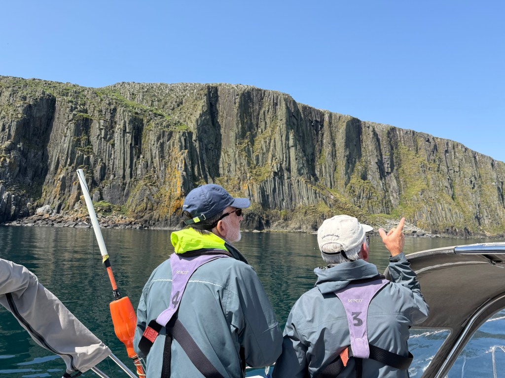 We spotted several small porpoises inside the bay whose behavior resembled that of our Dalls Porpoises in the northwest. We also met up with the same pod of larger dolphins seen yesterday at the mouth of the bay and not long after spotted the Shiant Islands visible as we crossed The Little Minch. There we also encountered a “bait ball” of small fish being dined upon by numerous diving birds including dive-bombing Gannets.