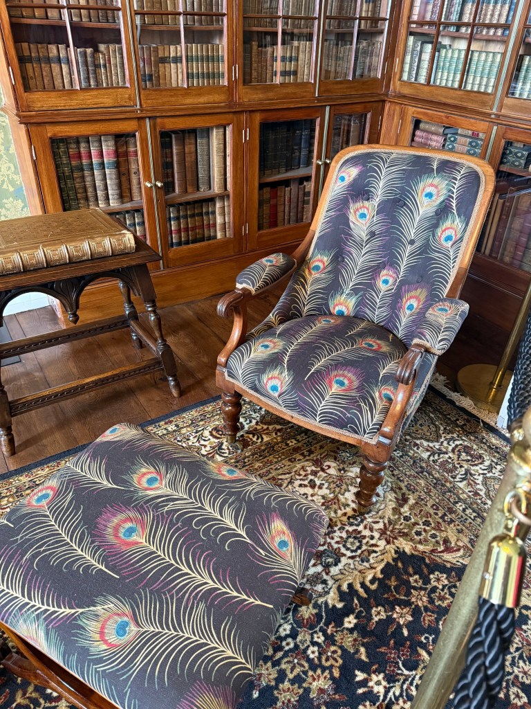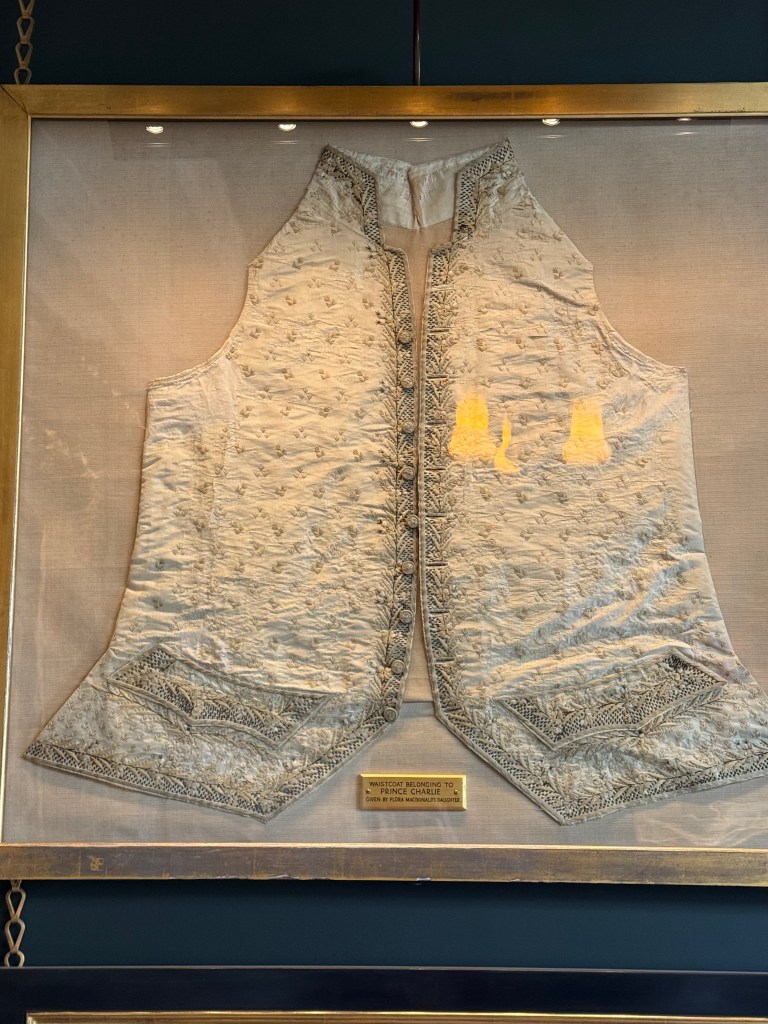 An impressive chair and foot stool (left), and the waistcoat of Bonnie Prince Charlie (right)