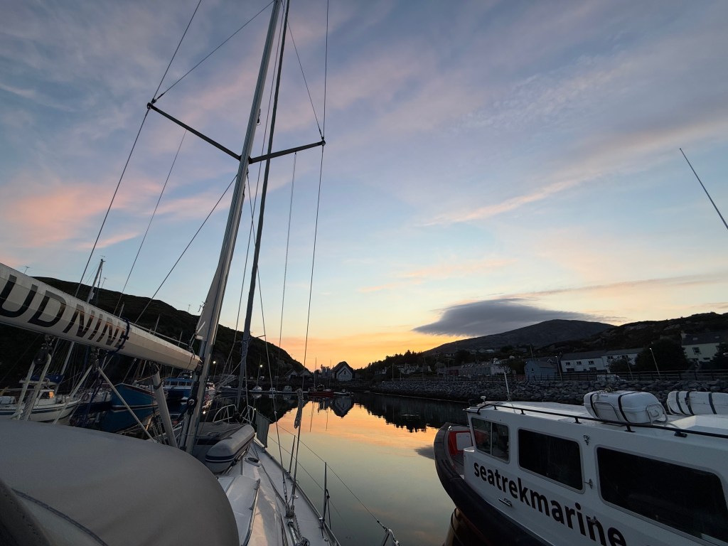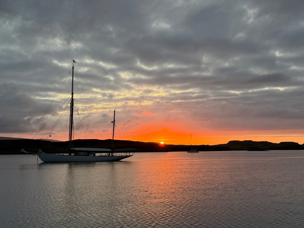 I was a pleasure to drop the hook not far from a very large, well-preserved, and fully functional gaff-rigged ketch over which the sun set a few hours later.